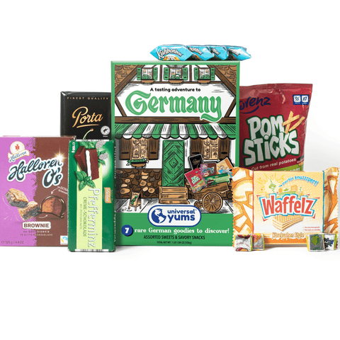 Experience the flavors of Germany with our curated snack box! Enjoy indulgent brownie batter chocolate, soft salty caramels, tangy sour fruit chews, rich dark chocolate with peppermint cream, Germany’s famous sour cream potato sticks, a smooth milk chocolate bar filled with amarena cherry, and crispy cookie wafers with a delightful "Käsekuchen" twist. A true taste of Germany in every bite!